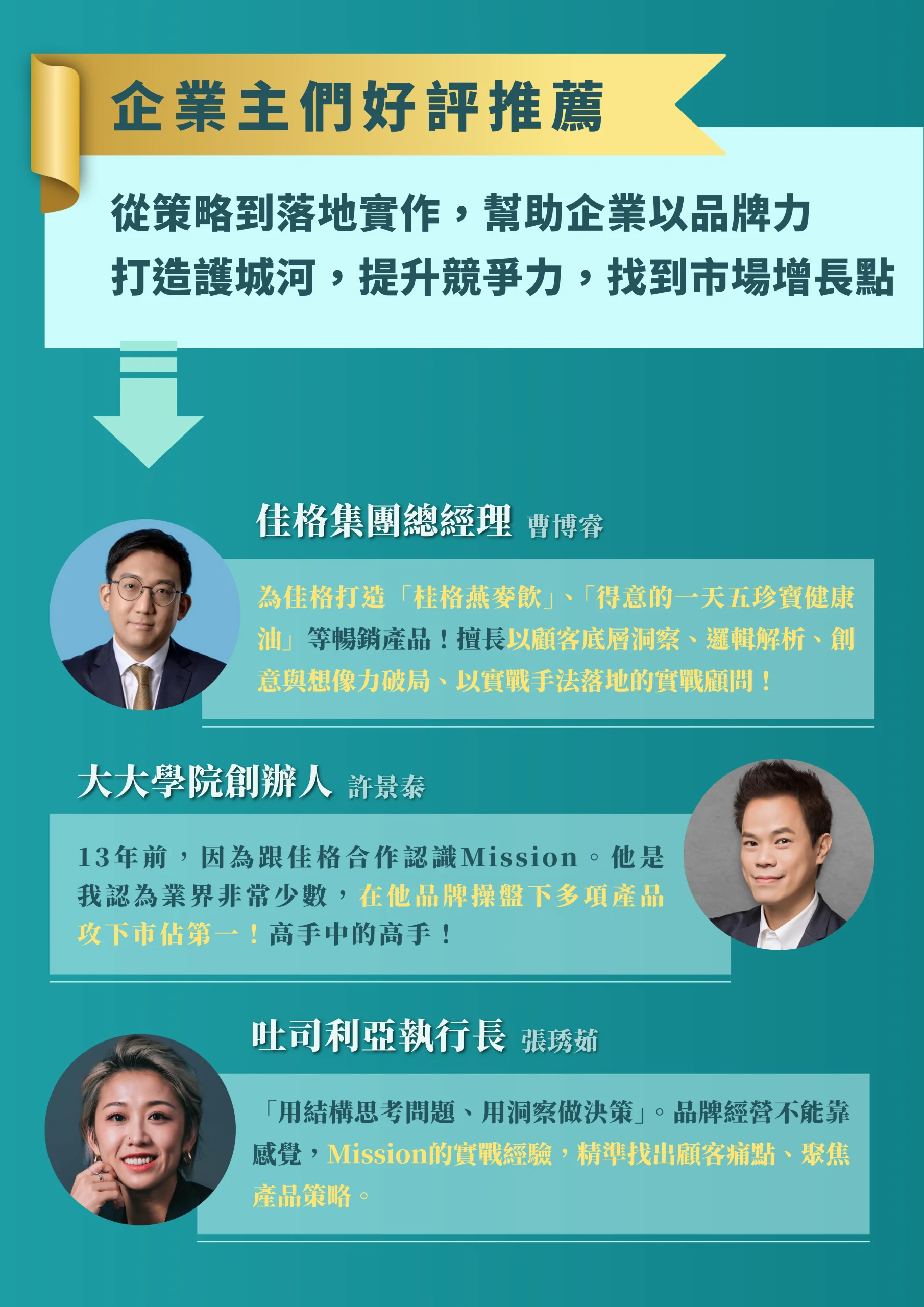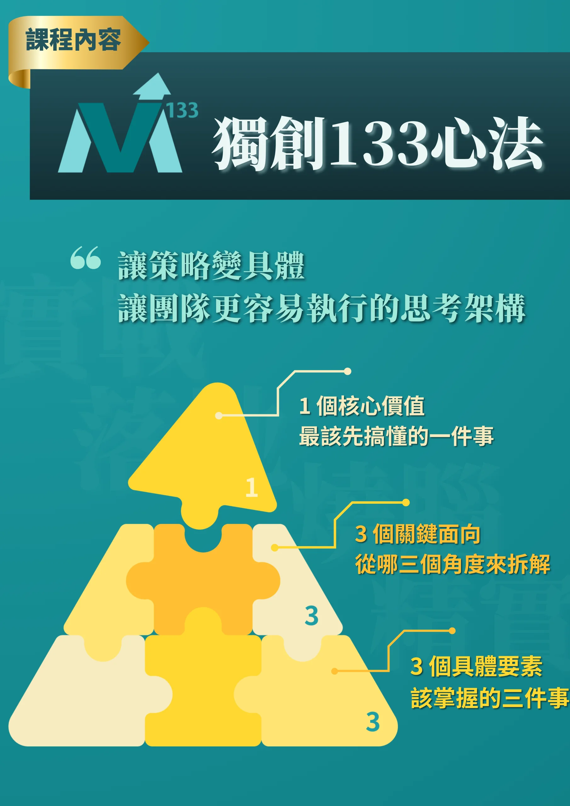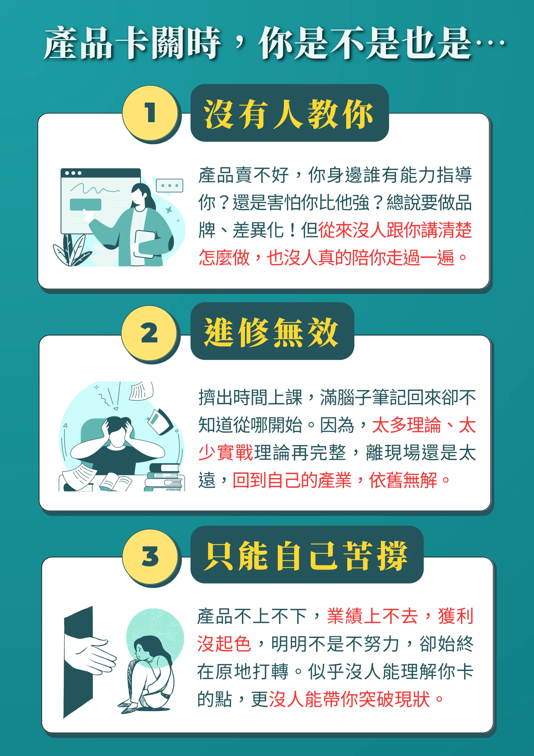 在外面上了一堆課程,結果只學到沒用的商業理論嗎?Mission 顧問開出價值百萬元實戰課程,以21年的實戰經驗為基底,將獨門心法系統化配合案例分析、討論燒腦,帶你建立起打造暢銷產品所需要的關鍵思維,不管你是中小企業主還是產品經理,這門課將帶你了解產品流程、方法和實作技巧,看市場銷售冠軍如何思考與佈局,培養「從單點到全局」的產品思考視野